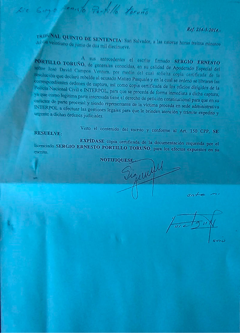 El abogado Sergio Ernesto Portillo Toruño, actuando en su calidad de apoderado legal especial del también profesional del derecho, José David Campos Ventura, solicitó el Tribunal 5° de Sentencia la citada documentación para pedir a INTERPOL que “le brinden atención y trámite expedito y urgente a dichas órdenes judiciales”, refiriéndose a la documentación donde se manda a arrestar al canadiense Matteo Pasquale.