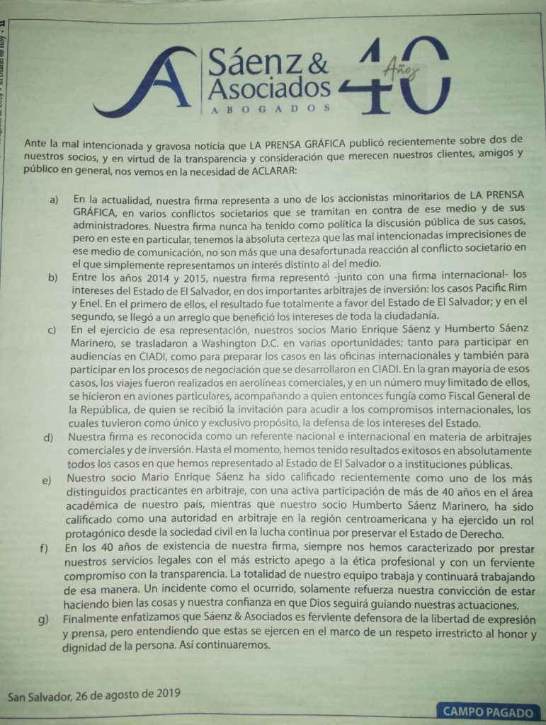 En el comunicado, los abogados Sáenz detallan que durante los años 2014 y 2015 la firma representó, junto con una firma internacional, los intereses del Estado de El Salvador, en dos importantes arbitrajes de inversión: “los casos (son) Pacific Rim y Enel. En el primero de ellos, el resultado fue totalmente a favor del Estado de El Salvador; y en el segundo, se llegó a un arreglo que benefició los intereses de de toda la ciudadanía”, agrega.