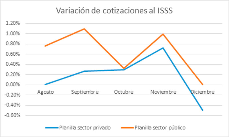 La tendencia mostrada del comportamiento de la economía visto a través de la recaudación del IVA se puede contrastar con la información de empleo con la que se dispone. El ISSS publica periódicamente datos concernientes a las cotizaciones. Si se toman los trabajadores en planilla , la tendencia es la siguiente: