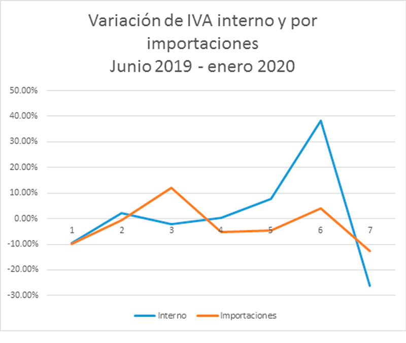 Los datos del Ministerio de Hacienda referidos antes permiten examinar esa relación entre abastecimiento interno e importación, tomando el IVA otra vez como indicador de aproximación.