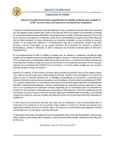 Comunicados y anuncios Sala de lo Constitucional reitera cumplimiento de medidas sanitarias para combatir el COVID-19 en el marco del texto de la Constitución de la República 27 marzo, 2020 El Independiente