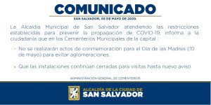 La alcaldía de San Salvador informa que debido a la emergencia por el coronavirus en los cementerios no se realizarán actos para conmemorar el Día de las Madres, a fin de evitar aglomeraciones.