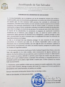 El arzobispo finalizó el comunicado exhortando a todos los salvadoreños a unirse en oración para no permitir que el COVID-19 avance y vivir como hermanos, en justicia y en caridad.