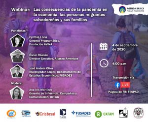 Comunicados y anuncios Invitación a Webinar: Las consecuencias de la pandemia en la economía, las personas migrantes salvadoreñas y sus familias 4 septiembre, 2020 El Independiente