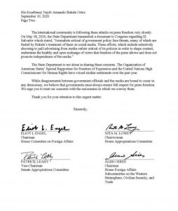 La carta enviada al presidente Bukele fue firmada por Eliot L. Engel, presidente del Comité de Asuntos Exteriores de la Cámara de Representantes, Nita M. Lowey, Albio Sires, James P. McGovern, Joaquin Castro, Norma J. Torres, Adriano Espaillat, Juan Vargas, Gregory W. Meeks y Vicente González, y los senadores Patrick Leahy y Benjamin L. Cardin. Ellos pidieron al gobernante salvadoreño tomar las observaciones con seriedad, expresándole que los ataques a la libertad de prensa son seguidos de cerca por la comunidad internacional.