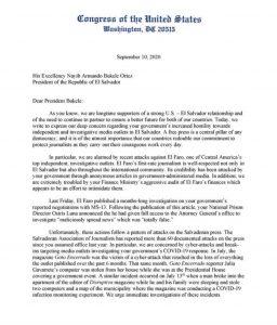 Diez congresistas y dos senadores demócratas de los Estados Unidos le manifestaron en una carta de dos páginas al presidente Nayib Bukele su “profunda preocupación” y “alarma” por la hostilidad de su gobierno a los medios de comunicación independientes y de investigación en El Salvador.