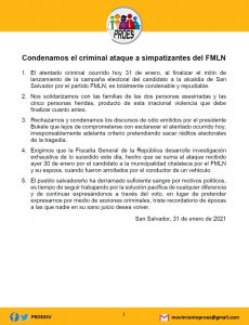 Comunicados y anuncios PROES condena ataque contra simpatizantes del FMLN 1 febrero, 2021 El Independiente