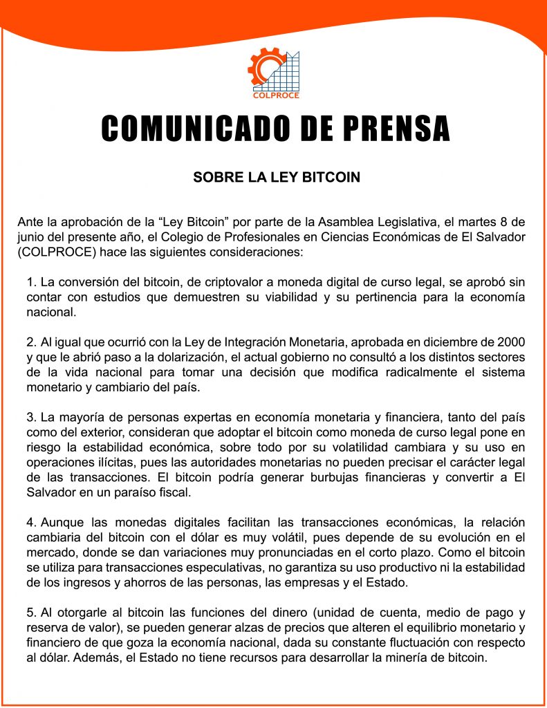 Ante la aprobación de la “Ley Bitcoin” por parte de la Asamblea Legislativa, el martes 8 de junio del presente año, el Colegio de Profesionales en Ciencias Económicas de El Salvador (COLPROCE) hace las siguientes consideraciones.