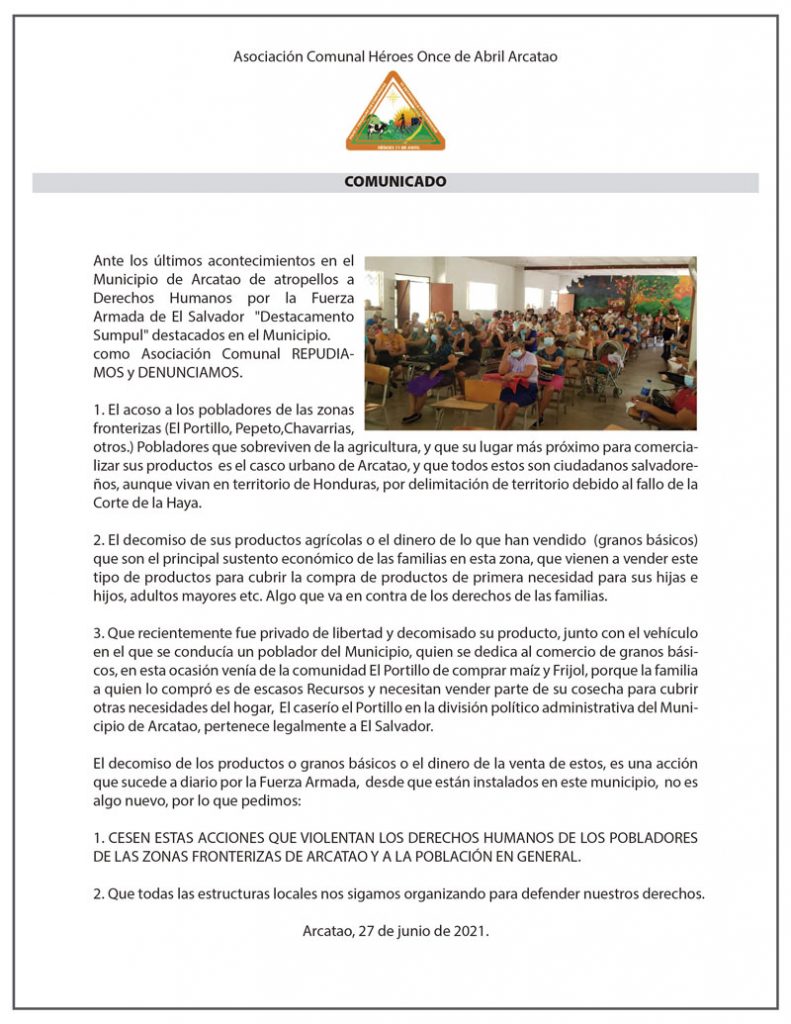 COMUNICADO: Asociación Comunal Héroes Once de Abril Arcatao