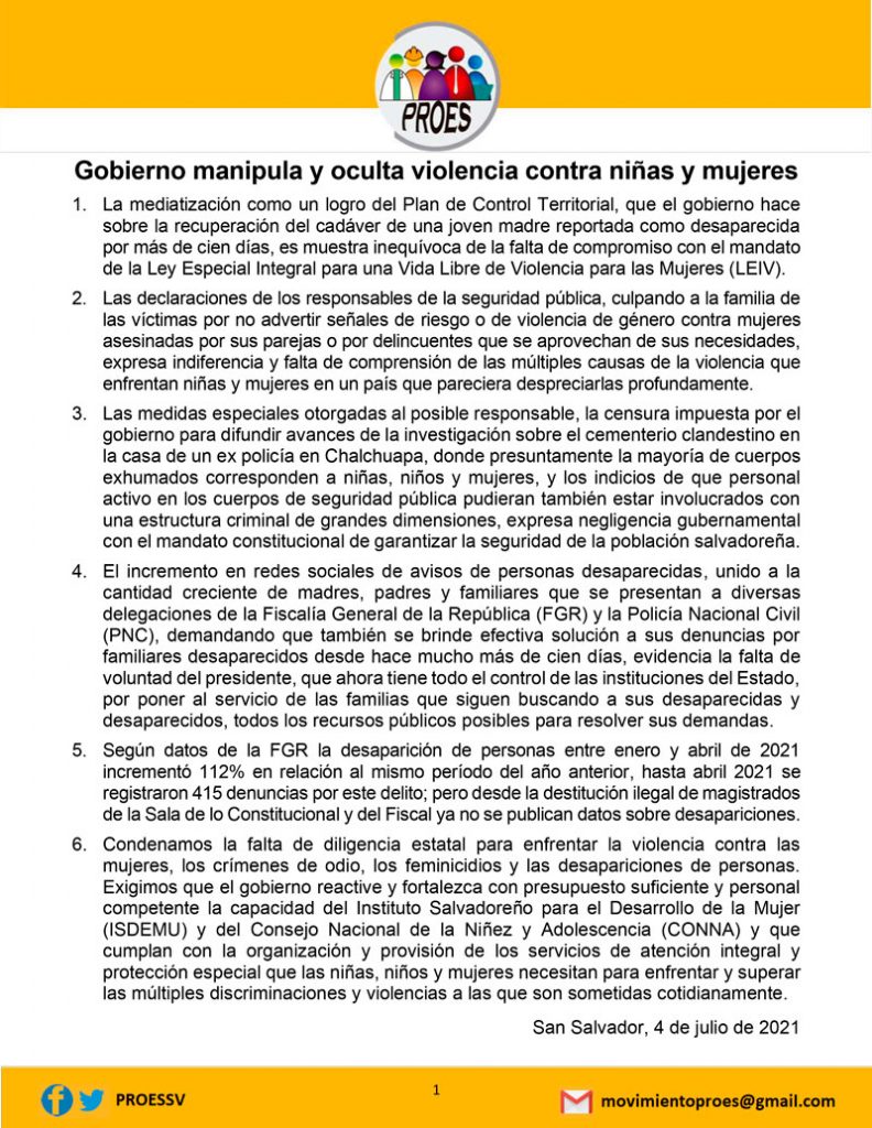 La mediatización como un logro del Plan de Control Territorial, que el gobierno hace sobre la recuperación del cadáver de una joven madre reportada como desaparecida por más de cien días, es muestra inequívoca de la falta de compromiso con el mandato de la Ley Especial Integral para una Vida Libre de Violencia para las Mujeres (LEIV).