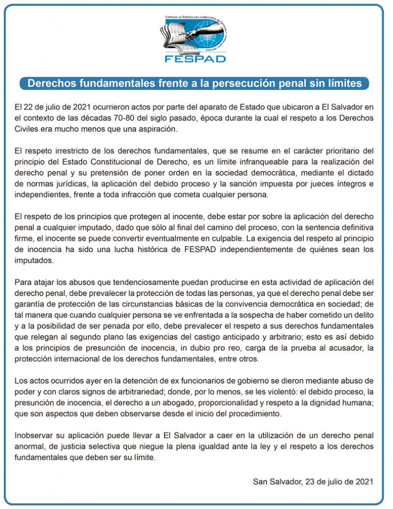 El 22 de julio de 2021 ocurrieron actos por parte del aparato de Estado que ubicaron a El Salvador en el contexto de las décadas 70-80 del siglo pasado, época durante la cual el respeto a los Derechos Civiles era mucho menos que una aspiración.