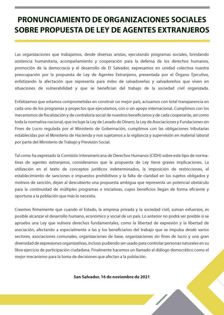 Las organizaciones que trabajamos, desde diversas aristas, ejecutando programas sociales, brindando asistencia humanitaria, acompañamiento y cooperación para la defensa de los derechos humanos, promoción de la democracia y el desarrollo de El Salvador, expresamos en unidad colectiva nuestra preocupación por la propuesta de Ley de Agentes Extranjeros, presentada por el Órgano Ejecutivo, enfatizando la afectación que representa para miles de salvadoreñas y salvadoreños que viven en situaciones de vulnerabilidad y que se benefician del trabajo de la sociedad civil organizada.