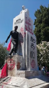 Tengamos en cuenta además, que muy pocos días antes de esa medida se produjo una extraordinaria movilización popular en toda la región que obligo al gobernador a vetar la ley de Zonificación Minera de la Meseta (léase megaminería) que los diputados provinciales habían sido aprobada entre gallos y medianoche. Son impresionantes las imágenes de las movilizaciones populares defendiendo el agua, un recurso escaso en todas partes y especialmente en patagonia. La lucha tiene sentido. En ese contexto, la Casa de Gobierno provincial y la Legislatura de Rawson terminaron incendiadas y la mayoría de las pintadas mencionaba la palabra “traidores” siendo además grafiteada la estatua del general Roca con un elocuente “genocida”.