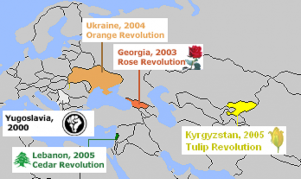 Entre 2000 y 2005 varios países ex soviéticos, pero que permanecían cercanos a la Federación Rusa, sufrieron las llamadas “revoluciones de colores”, aparentemente populares y no violentas, que formaron parte de un proyecto elaborado en Estados Unidos y ejecutado con ayuda de la Unión Europea.