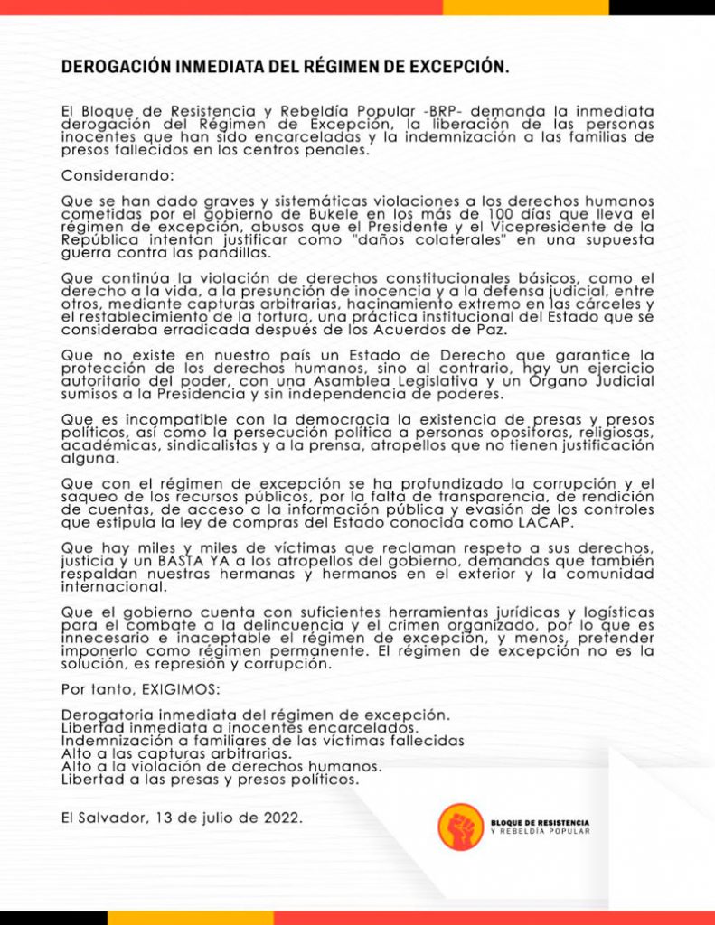 El Bloque de Resistencia y Rebeldía Popular -BRP- demanda la inmediata derogación del Régimen de Excepción, la liberación de las personas inocentes que han sido encarceladas y la indemnización a las familias de presos fallecidos en los centros penales.
