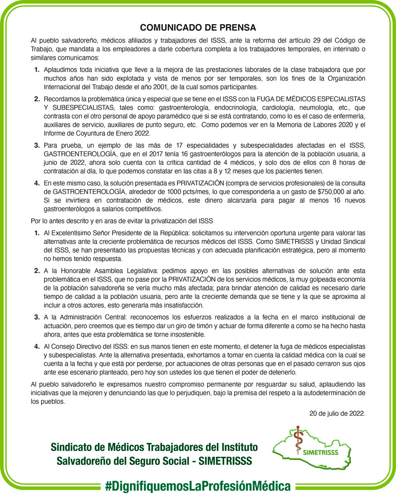 Al pueblo salvadoreño, médicos afiliados y trabajadores del ISSS, ante la reforma del artículo 29 del Código de Trabajo, que mandata a los empleadores a darle conbertura completa a los trabajadores temporales, en interinato o similares comunicamos: