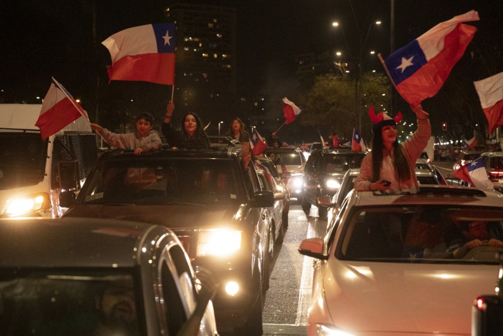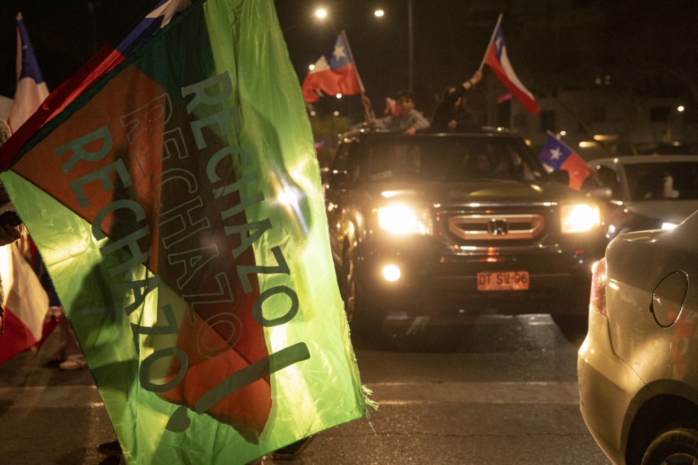 “Aguante Carabineros de Chile, ¡viva!”, grita mientras aplaude un joven 20 años, remera para la cálida noche santiaguina, bandera chilena en mano. Y dice que ganó el Rechazo porque “primó la raíz chilena”.