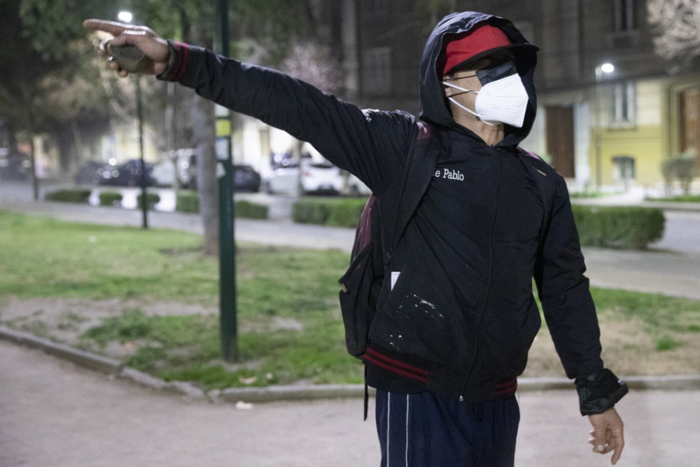 ¡Son puros ricos!, ¿ha visto un pobre ahí?. Doble barbijo, visera casi hasta la nariz, en la mano una piedra. Dice que los que festejan, a tan pocas cuadras de Plaza Dignidad, son puros ricos, y que el Rechazo no es más que nuestro pueblo secuestrado por los medios de comunicación, eso no es el pueblo.