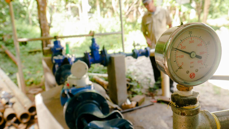 Desde la bomba, movida por un motor de 30 caballos de fuerza, se empuja el agua por tubería desde el pozo hasta un tanque enclavado en la cima de una colina, a unos cinco kilómetros de distancia en línea recta.