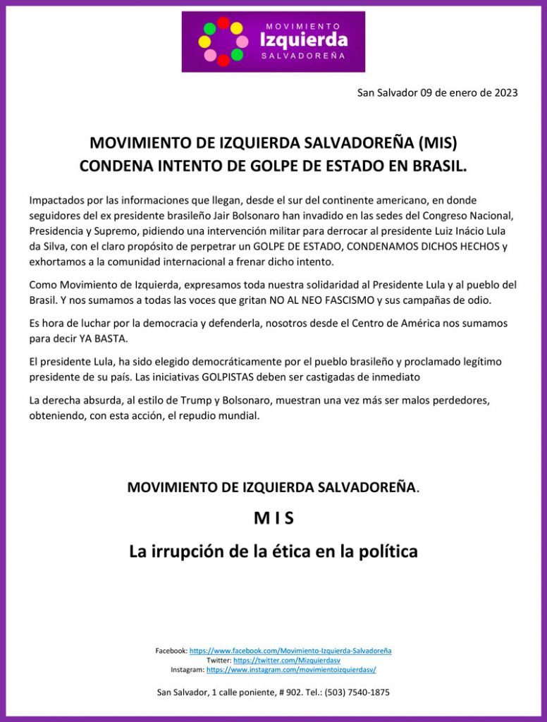 COMUNICADO: Movimiento de Izquierda Salvadoreña (MIS) Condena intento de golpe de estado en Brasil