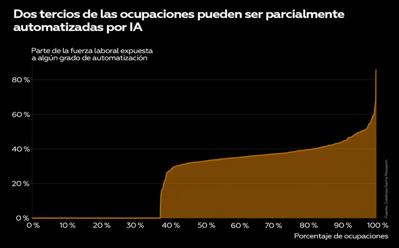 Alrededor de dos tercios de las más de 900 ocupaciones que existen en el mercado laboral estadounidense estarán expuestos a algún grado de automatización a medida que avanza la tecnología en materia de inteligencia artificial (IA), estimaron recientemente dos investigadores del banco de inversión Goldman Sachs.