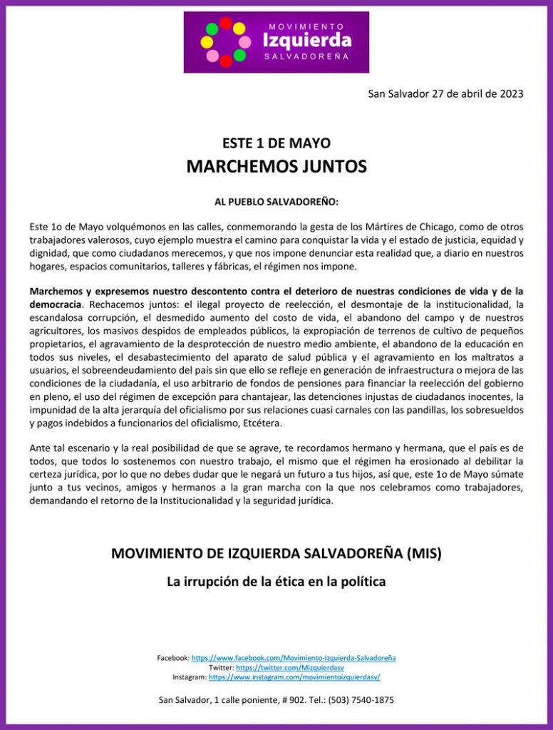 Marchemos y expresemos nuestro descontento contra el deterioro de nuestras condiciones de vida y de la democracia. Rechacemos juntos: el ilegal proyecto de reelección, el desmontaje de la institucionalidad, la escandalosa corrupción, el desmedido aumento del costo de vida, el abandono del campo y de nuestros agricultores, los masivos despidos de empleados públicos, la expropiación de terrenos de cultivo de pequeños propietarios, el agravamiento de la desprotección de nuestro medio ambiente, el abandono de la educación en todos sus niveles, el desabastecimiento del aparato de salud pública y el agravamiento en los maltratos a usuarios, el sobreendeudamiento del país sin que ello se refleje en generación de infraestructura o mejora de las condiciones de la ciudadanía, el uso arbitrario de fondos de pensiones para financiar la reelección del gobierno en pleno, el uso del régimen de excepción para chantajear, las detenciones injustas de ciudadanos inocentes, la impunidad de la alta jerarquía del oficialismo por sus relaciones cuasi carnales con las pandillas, los sobresueldos y pagos indebidos a funcionarios del oficialismo, Etcétera.