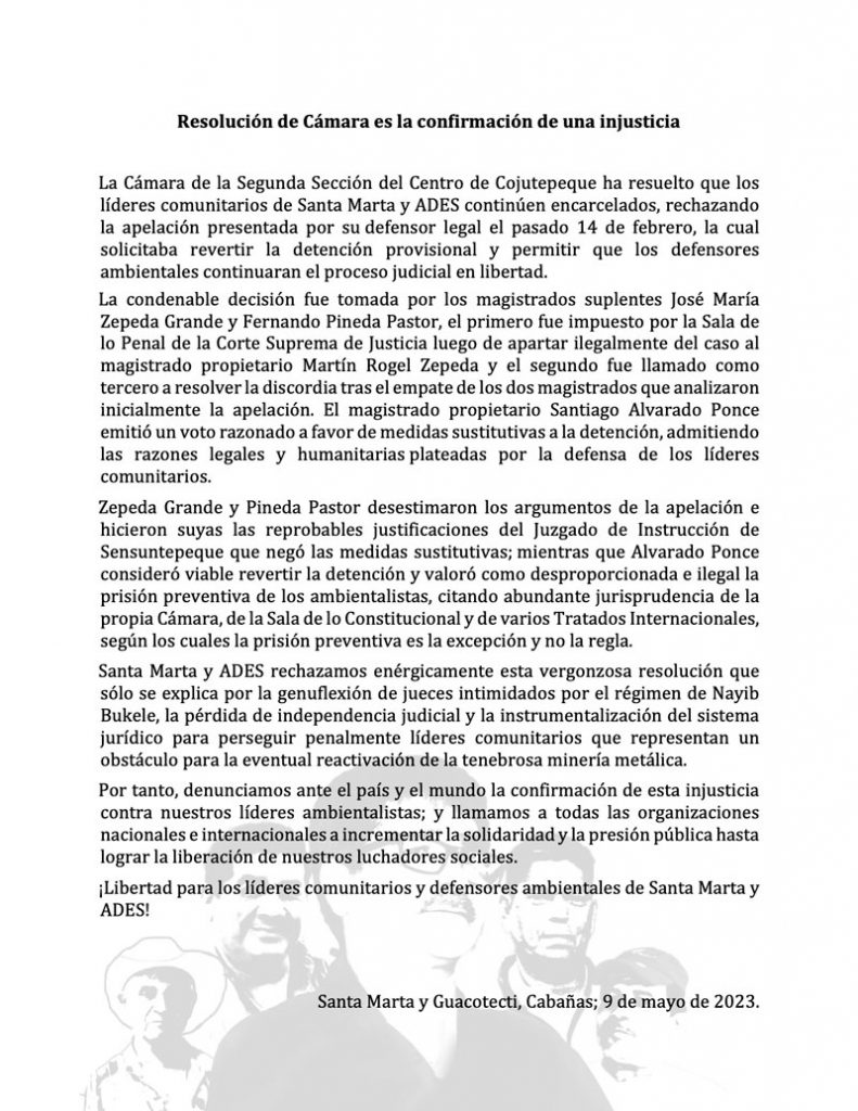 Comunicados y anuncios COMUNICADO: Santa Marta y ADES condenan resolución que ratifica la detención de los líderes comunitarios, por ser la confirmación de una grave injusticia. 9 mayo, 2023 El Independiente