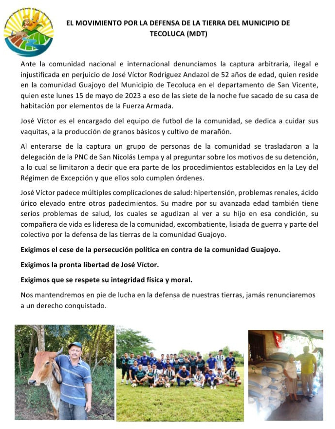 Ante la comunidad nacional e internacional denunciamos la captura arbitraria, ilegal e injustificada en perjucio de José Vícto Rodríguez Andazol, de 52 años de edad, quien reside en la comunidad Guajoyo del Municipio de Tecoluca en el departamento de San Vicente.