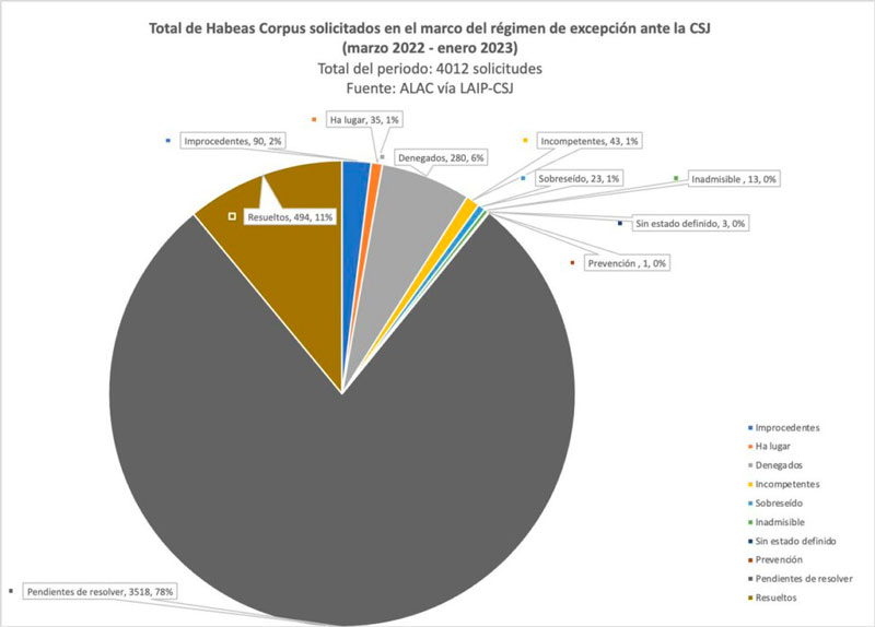 Un informe de la organización Asesoría Legal Anticorrupción (Alac), reportó que de las 4012 solicitudes de habeas corpus recibidas entre marzo de 2022 y enero de 2023, solo se han resuelto 22 %.