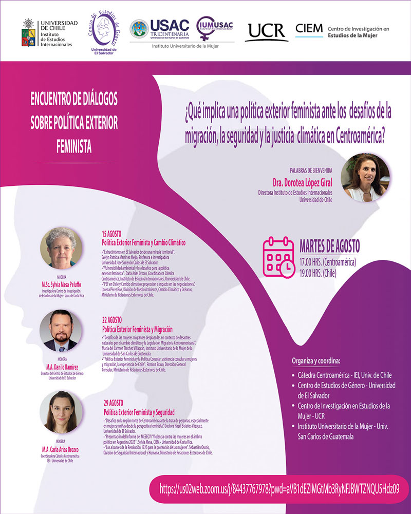 La Cátedra Centroamérica del Instituto de Estudios Internacionales de la Universidad de Chile, la Universidad de Costa Rica – CIEM, el Centro de Estudios de Género – Universidad de El Salvador y la Universidad de San Carlos de Guatemala – IUMUSAC, realizarán el Encuentro de Diálogos sobre Política Exterior Feminista «Que implica una política exterior feminista ante los desafíos de la migración, la seguridad y la justicia climática en Centroamérica?».