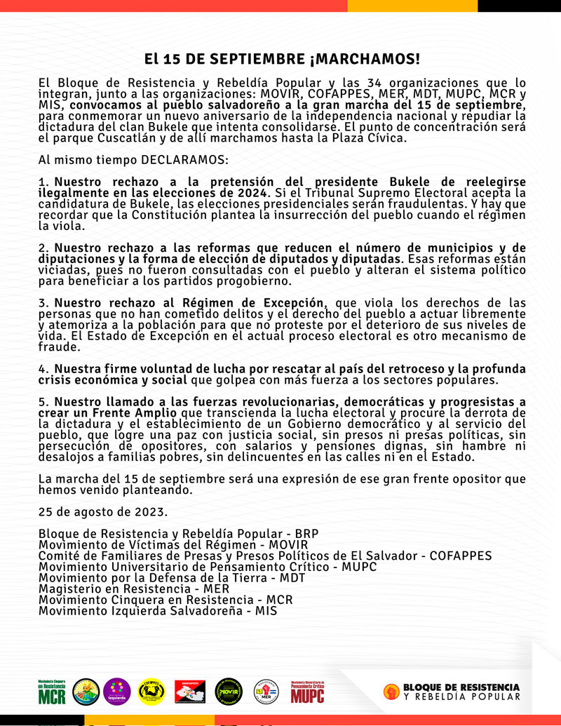 El Bloque de Resistencia y Rebeldía Popular y las 34 organizaciones que lo integran, junto a las organizaciones: MOVIR, COFAPPES, MER, MDT, MUPC,MCR y MIS, convocamos al pueblo salvadoreño a la gran marcha del 15 de septiembre