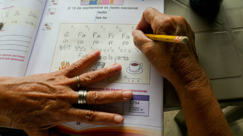 “A veces iba a oficinas al pueblo de Ilobasco, y sentía feo cuando veía rótulos con mensajes escritos y yo no podía entender las palabras”, contó Carmen Molina, de 66 años, mientras trabajaba en una cartilla, escribiendo palabras y resolviendo sumas y restas sencillas.