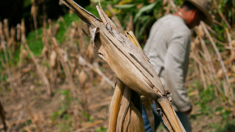 En esta fase, el tallo de las plantas de maíz ha sido ya “doblado”, una práctica campesina que ayuda a secar la mazorca, la fase final del proceso antes de su cosecha.