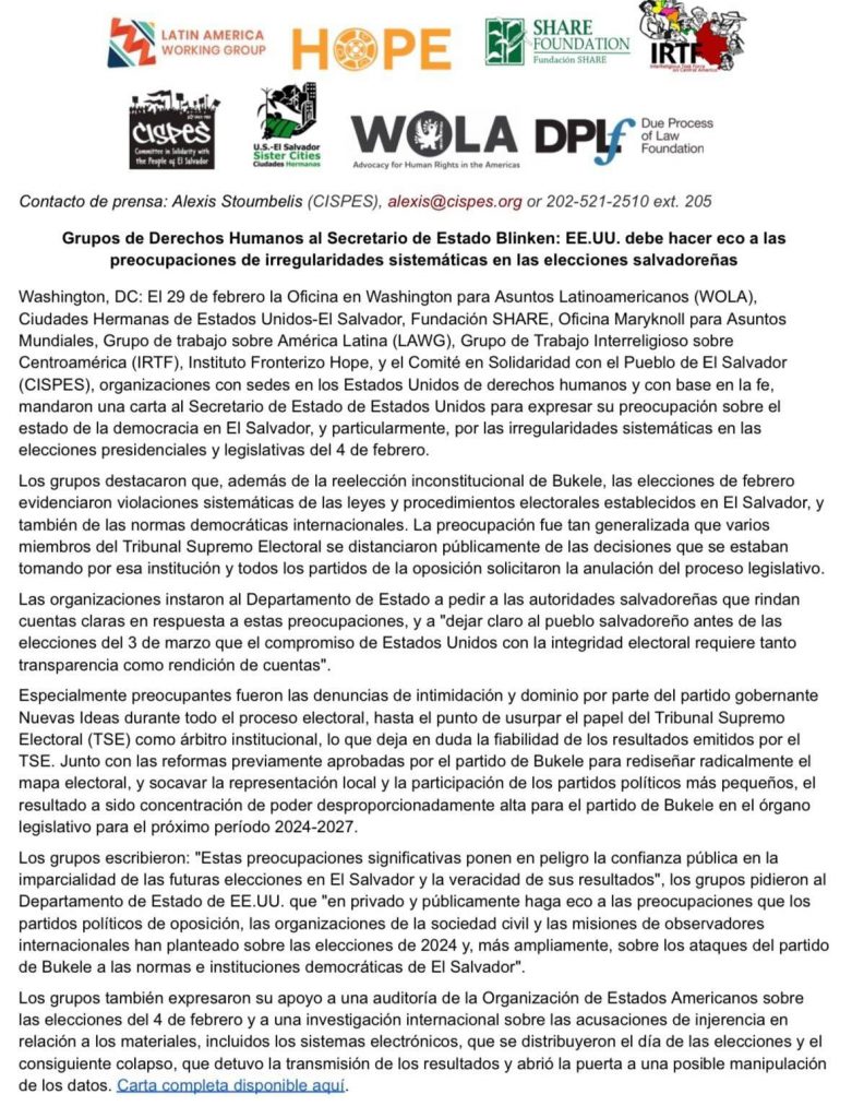 Comunicados y anuncios Comunicado | Grupos de Derechos Humanos al Secretario de Estado Blinken 2 marzo, 2024 El Independiente