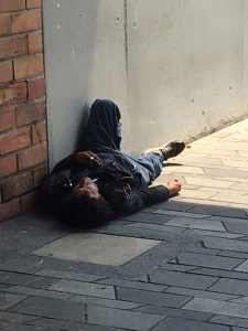 Está tirado en medio de la acera en una posición fetal en la que su mano tapa su cara sobre la que se proyecta el sol de la mañana. Sus ajadas zapatillas están a su lado así como un saco mediano en el que hay botellas de plástico usadas que no le sirve de almohada. El torso desnudo. Su delgadez es extrema. Es uno más de la veintena de hombres de la calle yacentes con que me he encontrado esta mañana en mi deambular cruzando el centro de la ciudad. Poco más adelante me fijo en un policía al que le están lustrando las botas mientras mira su celular y mantiene un palillo en su boca con el que juega nerviosamente. A unos pocos metros tres colegas uniformados devoran compulsivamente sus celulares. El escenario se desvanece inmediatamente porque al doblar la siguiente esquina me encuentro en la zona turística por excelencia de la ciudad. Las esculturas del artista famoso, el museo departamental, el trepidante mundo del comercio. Todo ello no aleja de mí la imagen del hombre en el suelo que dejé atrás. De los demás. Permanecen contemplados y reconocidos como un retrato más del muestrario urbano que un flâneur como yo registra compulsivamente. Una situación asumida por todo el mundo que pasa de lado y que no produce reacción alguna.