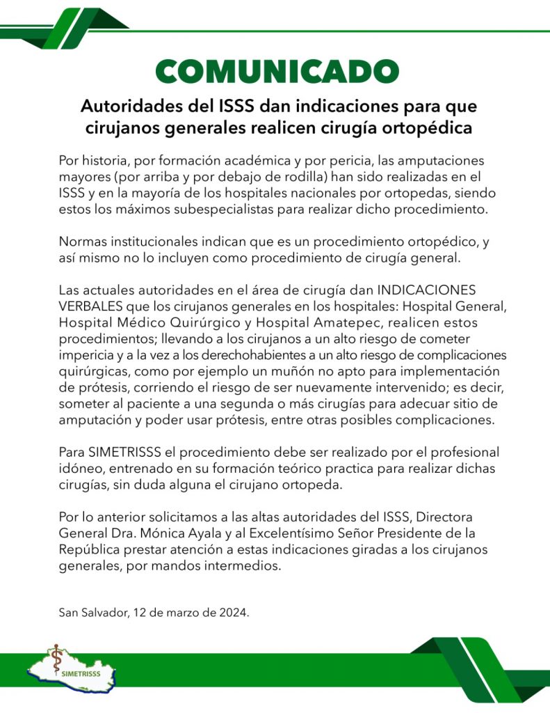 Comunicado SIMESTRISSS: Autoridades del ISSS dan indicaciones para que cirujanos generales realicen cirugía ortopédica