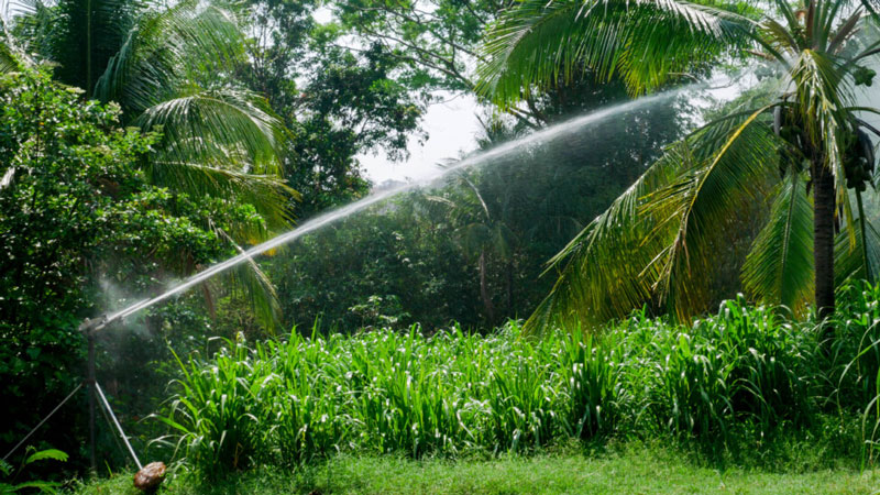 Un sistema de riego por aspersión mantiene saludable y nutritivo el pastizal que se cultiva en la finca ganadera Texas Ranch, en el norte de El Salvador, con el que en parte se alimenta a las 100 cabezas de ganado que producen la leche que luego se vende a una empresa láctea.