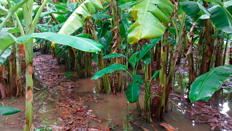 Una plantación de bananos completamente anegada es parte de los daños provocados en los cultivos en las zonas bajas de El Salvador por las intensas lluvias de junio. Las autoridades del ministerio de Agricultura y Ganadería reportaron que las lluvias afectaron 36,2 % de cultivos de frutas, hortalizas y granos básicos.