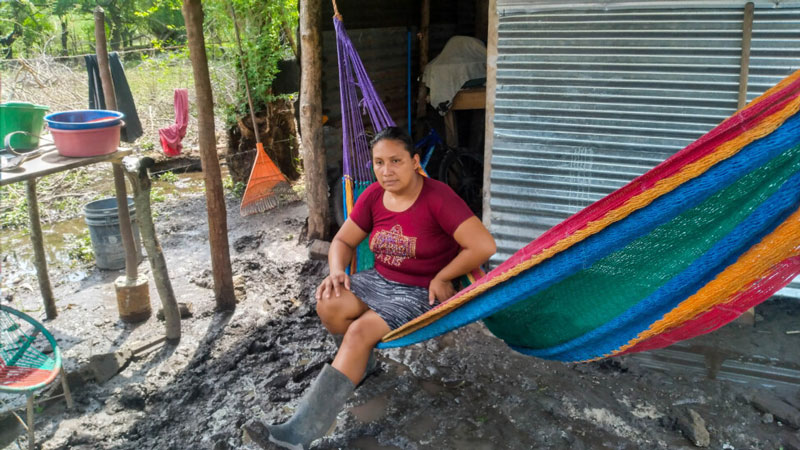 En medio del barro, Xiomara García, de 30 años, toma un descanso en sus actividades diarias, en la entrada de su pequeña casa que resultó inundada tras desbordarse el río Grande de San Miguel, en el este de El Salvador, a mediados de junio.