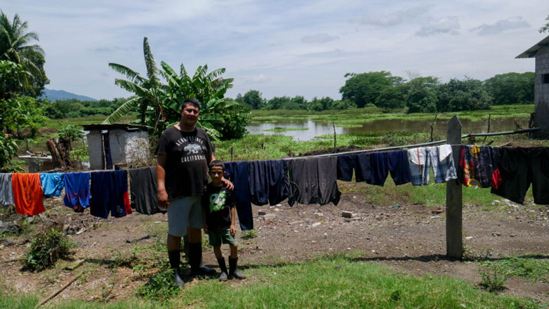 Fabricio Zelaya, junto a uno de sus tres hijos, residentes en el caserío Casa Mota, en el este de El Salvador, posan para mostrar el fondo aún anegado del potrero o pastizal, debido las lluvias ocurridas entre el 14 y 21 de junio.
