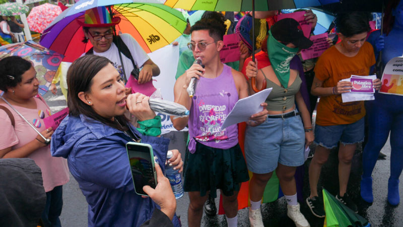 Cindy Moreno, del colectivo Alejandría, en una improvisada conferencia de prensa al inicio de la Marcha del Orgullo, en San Salvador, en la que entra otras cosas se denunció que al censurar una obra de teatro con contenido Lgbti, el presidente Nayin Bukele busca disfrazar de moralismoconservador la implementación de drásticas medidas económicas, como despidos de empleados estatales.