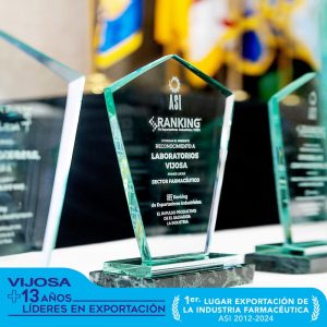 VIJOSA, una empresa con una trayectoria desde 1974, que ofrece un amplio portafolio con más de 700 medicamentos y distribuidora en más de 17 países en el mundo, recibió el galardón como líder farmacéutica con el mayor número de exportaciones.
