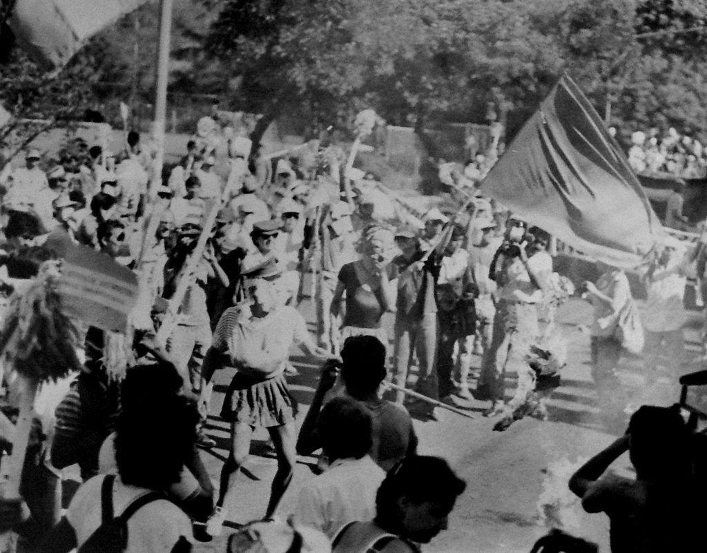 Era un acto de contestación opuesto a la fanfarria oficial del desfile que organizaba la alcaldía municipal y que llevaba encaramadas en sus carrozas a las candidatas a reina de “belleza” (¿según quién?) que en realidad lograban subirse vendiendo votos en sus respectivas colonias o escuelas.