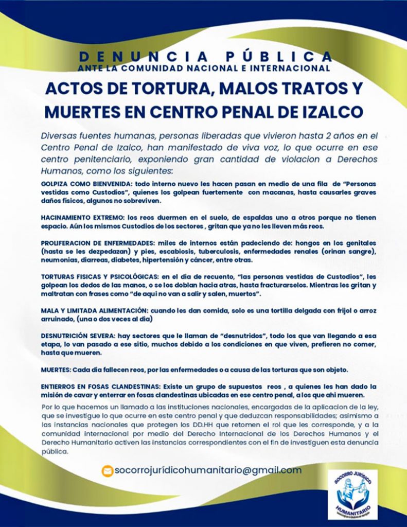 Comunicado Socorro Jurídico: Actos de tortura, malos tratos y muertes en centro penal de izalco