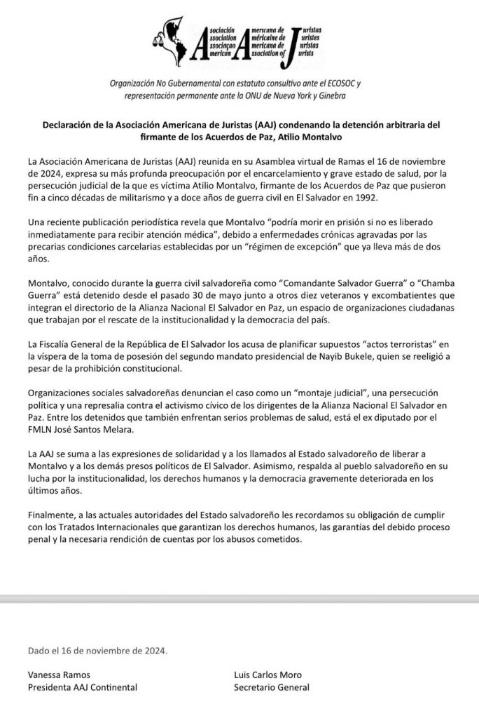 La Asociación Americana de Juristas (AAJ) reunida en su Asamblea virtual de Ramas el 16 de noviembre de 2024, expresa su más profunda preocupación por el encarcelamiento y grave estado de salud, por la persecución judicial de la que es víctima Atilio Montalvo, firmante de los Acuerdos de Paz que pusieron fin a cinco décadas de militarismo y a doce años de guerra civil en El Salvador en 1992.