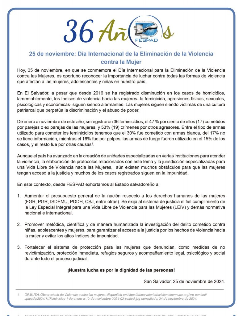 Comunicado FESPAD | 25 de noviembre: Día Internacional de la Eliminación de la Violencia contra la Mujer