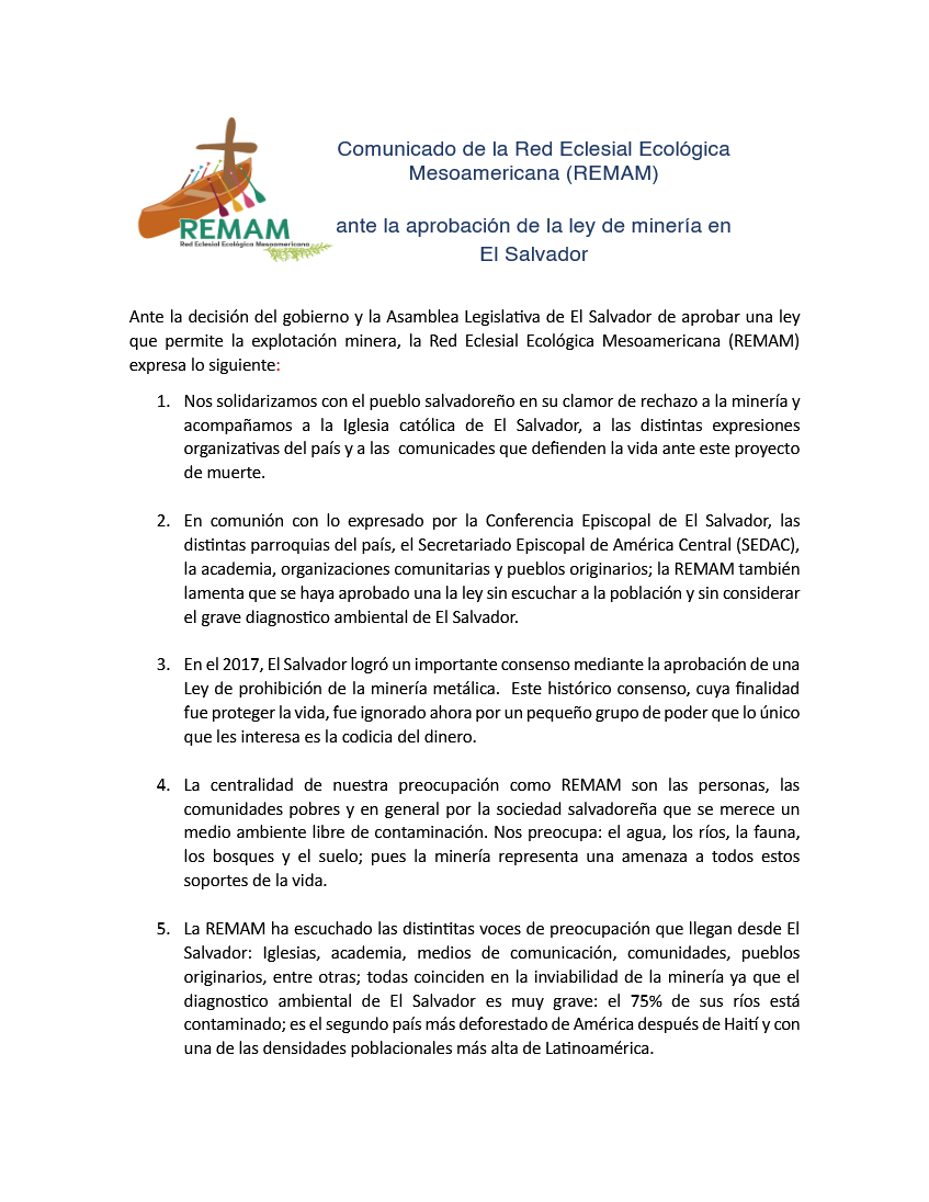 En este sentido, la Remam se une al clamor de rechazo expresados por la Iglesia católica de El Salvador, las parroquias del país, el Secretariado Episcopal de América Central (SEDAC), la academia, organizaciones comunitarias y pueblos originarios. A la vez lamentan que esta ley haya sido aprobada sin haber sido escuchada la voz de las comunidades y sin valorar el impacto enorme que causará al ecosistema.