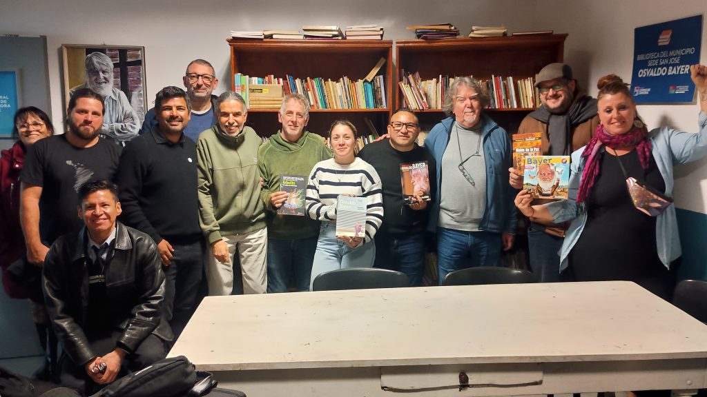 El sábado 24 de mayo, la Secretaría de Cultura de Lomas de Zamora, con muy buen tino, se sumó a otras tantas localidades del país que reaccionaron a la vandálica destrucción del monumento al Maestro Bayer en Rio Gallegos, y realizó un acto en el Centro Cultural San José donde en el marco de una muestra pictórica relacionada con DDHH, me tocó hablar sobre su memoria y legado en la hermosa Biblioteca que lleva su nombre y que fuera inaugurada por el mismo Osvaldo. La música también fue parte fundamental del encuentro ya que el acto cerró con interpretaciones de Ezequiel Jusid con temas emblemáticos de la banda Arbolito y la presencia de un stand con libros de la editorial Sudestada.
