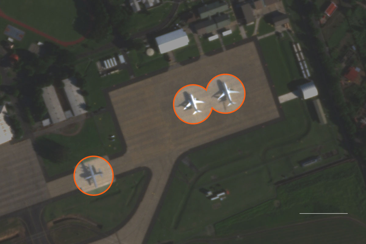 [Una imagen de satélite que muestra, señalados en naranja, los aviones militares estadounidenses en el aeropuerto internacional de El Salvador]
